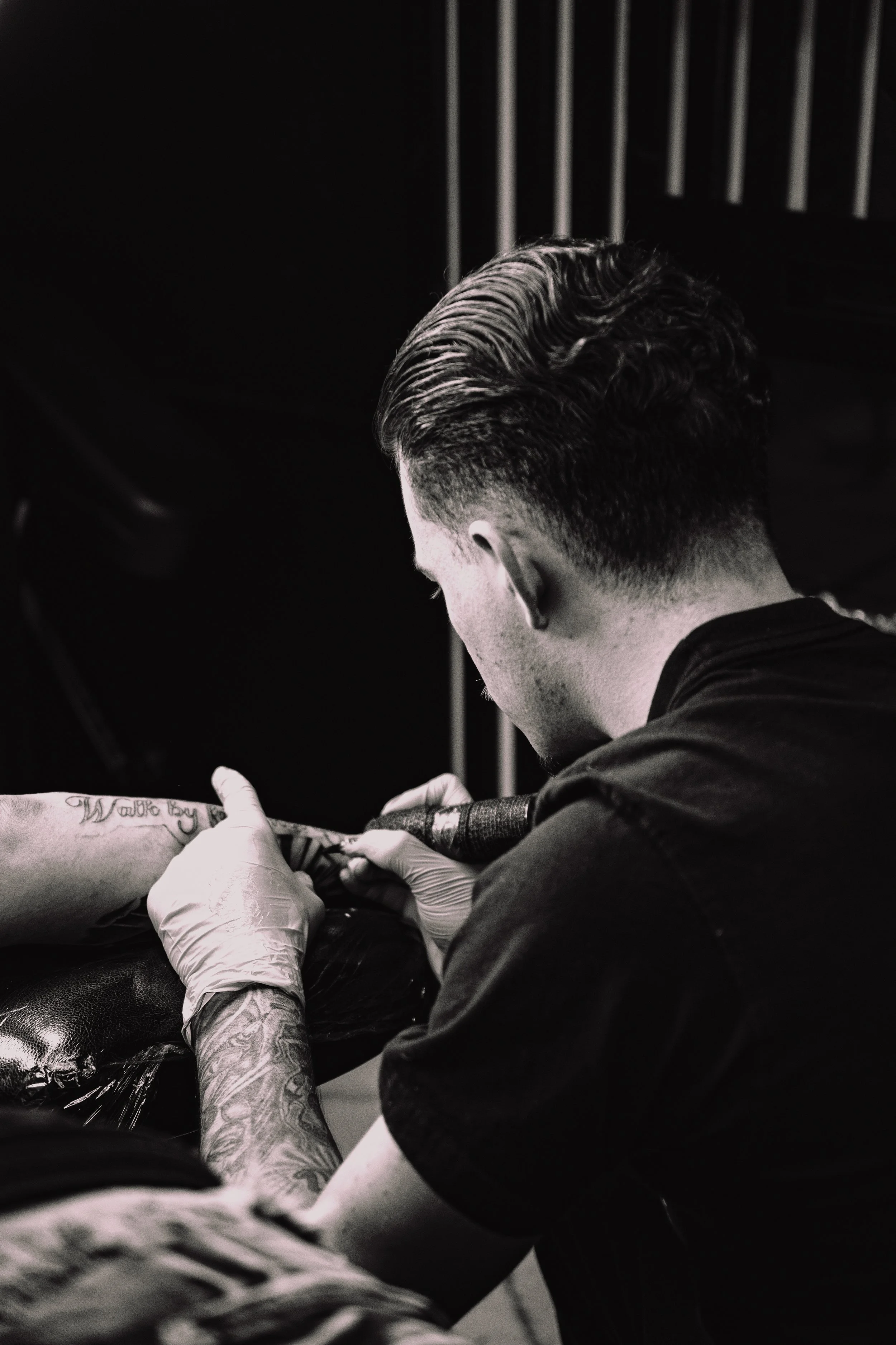 Our sterile work area is limited on space. To maintain focus and safety, only the client getting tattooed is allowed in the artist's station.